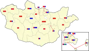 Members of the State Great Khural were elected from multi-seat constituencies in a Plurality-at-large system, with two to four seats per aimag or (in Ulaanbaatar) düüreg.[2] Previous elections had single-seat constituencies, and the new, more complicated voting system was reported to have led to a delay in vote counting.[3]
