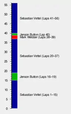 Hamilton made his only scheduled stop on lap 33, and his team-mate Kovalainen followed a lap later. Vettel stopped on lap 37 and Webber on lap 39, while two Brawn cars ran until laps 42 (Button) and 43 (Barrichello). Buemi was the last driver to make a scheduled stop, on lap 45 and after that race order was: Vettel, Webber, Button, Barrichello, Hamilton, Kovalainen, Sutil and Heidfeld. Nico Rosberg had tried intermediate tyres on his second stop but he spun soon after and pitted again for full wets.