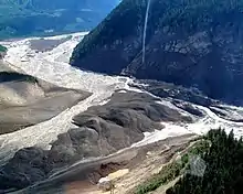The massif has been a source of large volcanic debris flows for the last 8,000 years, many of which have reached several tens of kilometres downstream in the Lillooet River valley.[6] It is arguably the most unstable mountain massif in Canada and may also be its most active landslide area.[6][1] The earliest identified Holocene landslide was in 7900 BP and further landslides occurred in 6250 BP, 5250 BP, 4400 BP, 2600 BP, 2400 BP, 2240 BP, 2170 BP, 1920 BP, 1860 BP, 870 BP, 800 BP, 630 BP, 370 BP, 210 BP, 150 BP and in 1931, 1947, 1972, 1975, 1984, 1986 and 1998.[6] These events were attributed to structurally weak volcanic rocks, glacial unloading, recent explosive volcanism and Little Ice Age glacial activity.[1]