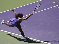 Williams then played the Australian Open where she was on a 14-match winning streak after winning the event in 2009 and 2010 but missing the 2011 edition. She was able to cruise pass the first three rounds. She beat Austrian Tamira Paszek in straight sets hitting 34 winners but also made 26 unforced error, in a first round match that started 30 minutes to 12 midnight.[4] At the second round, she defeated Barbora Záhlavová-Strýcová winning the first set at love and breaking serve once and by doing so, she earned her 500th tour win.[5] She then cruise pass Hungarian Gréta Arn with a loss of only 2 games to make through the fourth round. The match ended with 2 double faults and 59 minutes.[6] At the fourth round, she suffered a surprising loss to Russian Ekaterina Makarova at the fourth match point of the Russian. At the time, Makarova was the lowest ranked player left in the draw. Williams hit 37 unforced errors and 7 double faults in 2 sets. The loss ended her 17 match winning streak at the Open.[7]