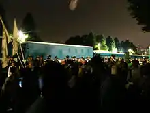 The legislation was controversial within Japan.[16] According to some polls conducted in July, at the time of the legislation's debate in the House of Representatives, two thirds of the Japanese public opposed the bills.[5] A protest on 16 July drew an estimated 100,000 people to the National Diet building.[5] Later protests in September ahead of the House of Councillors vote drew crowds of 10,000 to 30,000.[8]