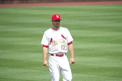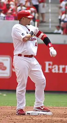 Bench coach Mike Aldrete vacated the Cardinals on October 27 for the same avocation with the Oakland Athletics.[19] The day after the World Series ended, October 30, Mark Ellis, Justin Masterson, Jason Motte, Pat Neshek, and A. J. Pierzynski all filed for free agency.[20] Four of the five players in the group signed with different teams in the 2014–15 off-season.[21][22][23][24] Only Motte, a former closer, had played for the Cardinals prior to 2014. He acceded a one-year contract with the Chicago Cubs.[22] The only free agent who did not endorse with another club was Ellis, who announced his retirement as a player on February 26, 2015.[25]