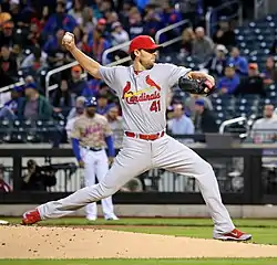 The club placed OF Peter Bourjos on three-day paternity leave on April 21, replacing him on the 25-man roster with RHP Mitch Harris. Harris was the first United States Naval Academy graduate to be called up to the majors since pitcher Nemo Gaines of the Washington Senators in 1921.[79] On April 25, Harris made his major-league debut, substituting for Wainwright in a game against Milwaukee after he suffered an ankle injury, and struck out his first batter, Adam Lind. Catcher Cody Stanley, who replaced Wainwright on the 25-man roster,[80] got a hit in his first major league at bat.[81] The Cardinals announced that Wainwright had an Achilles tendon rupture and would likely miss the remainder of the season.[82]