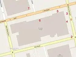 Most of the events happened in the streets and buildings around El Centro College, which forms a city block composed of multiple buildings. The block is bordered by Main Street on the south where the protest march was taking place; Lamar Street (now Botham Jean Blvd.) to the east from where Johnson initiated the shooting spree; and Elm Street to the north where Johnson eventually entered the college.[15]