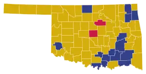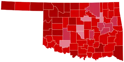 Oklahoma has been a Republican-leaning state since 1952, and a Republican stronghold since 1980. Trump subsequently carried the state with 65.3% of the vote, while Clinton received 28.9%.[3] Considered a safe Republican state, Oklahoma has voted Republican in fifteen of the last sixteen elections. It was also one of two states where Trump won every county, the other being West Virginia. This also marked the fourth consecutive election in which the Republican candidate carried every county in the state.[4]