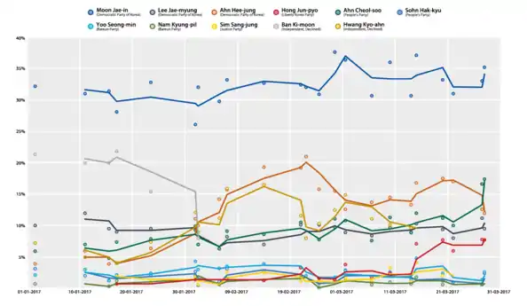 Opinion polling before April consistently placed the Democratic Party's candidate, Moon Jae-in, runner-up in the 2012 election, as the front-runner. Second place in the opinion polls was initially held by former UN Secretary-General Ban Ki-moon, who declined to run in February, followed by Ahn Hee-jung, whilst he lost the Democratic primaries to Moon. Support for People Party founder Ahn Cheol-soo then surged, threatening Moon's lead in the polls throughout early April, before descending to approximately equal that of Liberty Korea Party's candidate, Hong Jun-pyo, in final polls.
