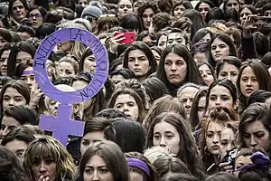 On 8 March 2018, International Women's Day, Spanish women went on strike for the day to denounce sexual discrimination, domestic violence and the wage gap.[1]