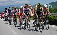 The first shakeup of the race occurred on stage six, where the breakaway took the stage. Fausto Masnada (Androni Giocattoli–Sidermec) beat Valerio Conti (UAE Team Emirates) to the line, beating the peloton by a full seven minutes. Conti was handed over the maglia rosa with the rest of the breakaway riders between him and Roglič because of this. Giovanni Carboni (Bardiani–CSF) gained the young rider classification also.[27] Stage seven was another day for the breakaway, this time Pello Bilbao (Astana) fending off Tony Gallopin (AG2R La Mondiale) for the victory.[28] Stage eight saw Caleb Ewan (Lotto–Soudal) take the sprint over Elia Viviani and Pascal Ackermann, the holder of the maglia ciclamino at the time.[29] Stage nine, the San Marino time trial that would round out the first week, saw Primož Roglič victorious again, this time only 11 seconds over Victor Campenaerts (Lotto–Soudal) and a full minute over Bauke Mollema (Trek–Segafredo) and the rest of the GC favorites. Conti still held the maglia rosa.[30]