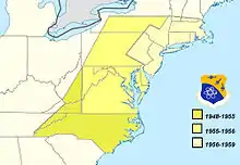Was established in October 1948 by Air Defense Command (ADC) as intermediate level of command.[1] Initially responsible for atmospheric air defense of middle Atlantic region from North Carolina to greater New York City area east of the Appalachian mountains. Commanded Manual Direction Center (MDC) at Roslyn Air Force Station, New York (P-3) 1948–1958 directing interceptor units to aircraft identified by Aircraft Control and Warning Squadrons at radar stations in AOR. It employed off shore naval picket ships, fixed "Texas Tower" radar sites, airborne early warning units, and a civilian Ground Observer Corps program. The latter phased down when the SAGE program was implemented.