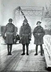 On 25 March 1917, the regiment was called up just before the United States entered World War I, which it did the following month. The regiment was mustered in between 25 March and 3 April. The regiment guarded bridges and railroads in Virginia. The regiment was drafted on 5 August and a month later departed by train for Camp McClellan, Alabama, arriving there on the evening of 6 September.[8] On 4 October, the 2nd Virginia consolidated with the 1st and 4th Virginia Infantry Regiments. The new regiment became the 116th Infantry, part of the 29th Infantry Division, then at Camp McClellan, Alabama. It served as part of the division's 58th Infantry Brigade alongside the 112th Machine-Gun Battalion and the 115th Infantry Regiment.[9] Colonel Robert F. Leedy of the 2nd Virginia became commander of the new regiment,[10] which included 105 officers and 3,686 enlisted men.[11] Colonel Hansford L. Threlkeld took command on 1 January. He was replaced by Colonel William J. Perry of the 1st Virginia on 1 May. On 5 June, Lieutenant Colonel Hobart M. Brown took command. Brown led the regiment until it reached France.[12]