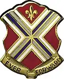 Approved on 31 March 1925, the Distinctive Unit Insignia is a Gold color metal and enamel device 13⁄16 inch (2.1 cm) in height overall consisting of a shield blazoned: Gules, a saltire Argent voided throughout per saltire Gray and Azure per cross counterchanged, in chief a fleur-de-lis Or. Attached below and to the sides of the shield a Gold bipartite scroll inscribed "EVER" to dexter and "FORWARD" to sinister in Black letters. The blue and gray on the insignia represents the mixed Confederate and Union lineage of the regiment and its artillery traditions. The fleur-de-lis symbolizes the regiment's service in France in World War I.[85]