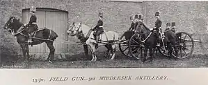 A number of early AVCs had manned semi-mobile 'position batteries' of smooth-bore field guns pulled by agricultural horses. Like all volunteer units the 3rd Middlesex conducted regular camps and took part in Volunteer reviews. In 1868 they attended the Volunteer review at Portsmouth, taking a horsed battery of 9-pounder smooth bore guns.[11] However, the War Office (WO) refused to pay for the upkeep of field guns and the concept died out in the 1870s.