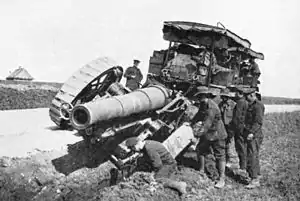 39th Siege Bty was equipped with four 8-inch howitzers.[6] At this stage of the war the 8-inch howitzers in use (Marks I–V) were improvised from cut-down and bored-out barrels of 6-inch coast defence guns, with the recoil checked by enormous wooden wedges.[8][9] The battery unloaded its guns at Boulogne on 5 November and between 13 and 15 November it emplaced them at Elverdinge, north of Ypres. On 19 November it began registering its guns on local targets with the help of air observation whenever the weather was clear enough. Some of these shoots brought down retaliatory fire from the Germans. Communications with the battery's own Forward Observation Officers (FOOs) in the front line were frequently cut by shellfire. From December the battery began short bombardments of requested targets, while continuing its registration. Regular targets included 'Von Spree Farm' and 'Essen Farm'. Requests came for bombardments of troublesome machine gun and mortar positions, SOS calls from frontline infantry subjected to trench raids, and for retaliatory shelling of gun positions. This routine continued through the early months of 1916, with the battery suffering a steady trickle of casualties. In late March the battery struggled to move a howitzer from its Left Section (LX) to a better position with the help of a Caterpillar tractor; the other followed two weeks later, as a result of which the sections temporarily became North and South (NX and SX) instead of the usual Left and Right (LX and RX).[10]