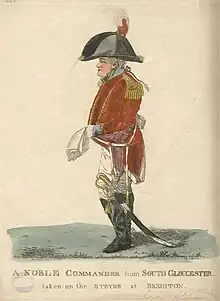In view of the worsening international situation the militia was embodied for service in 1792, even though Revolutionary France did not declare war on Britain until 1 February 1793. On 14 March 1794 the Earl of Berkeley was commissioned as a colonel in the Regular Army for the duration of the embodiment. Both Gloucestershire regiments were at Weymouth, Dorset, in 1795 when King George III stayed there and granted them the title 'Royal', but the North regiment lost its 'Fusiliers' distinction the following year.[6][18][20][23][24][30][31]