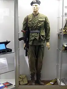 There was specialised equipment items such as the large rucksack, paratrooper knife, combat vest with pouch for a respirator and NBC kit,[11] rain coat, laced ankle boots,[11] and M1956 paratrooper helmets.[12] The paratroopers' arm-of-service color was orange, which was displayed on their collar and shoulder boards.[13]