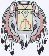 2. Description: An Assiniboin Indian tribe ceremonial shield of the grass dance, a ritual of the gods of plenty, in shades of tan, white, black, and green, pendanted with six feathers in shades of gray, red, black, and white; surmounting the shield a buffalo skull, in its proper colors, charged with a parfleche pouch, in its proper colors; the pouch marked with a symbolic design in bright shades of green, red, and blue. Significance: The emblem is symbolic of the squadron and the Assiniboin Indian tribe of Montana, where the squadron was organized in 1953. The three feathers on the left symbolize the character of the squadron personnel: skill, alertness, and pride, while the character of the Strategic Air Command is symbolized by the three feathers on the right: strength, vigilance, and steadfastness. The buffalo skull, used by the Assiniboin Indians in spiritual ceremonies, symbolizes power and plenty. Their parfleche pouch, used to transport meat and pemmican in their travels and to warriors in combat, symbolizes the function of the squadron. Lineage & Honors History.