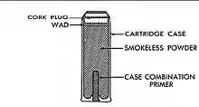 In 40 mm and larger guns, a cardboard disc, or wad, is forced into the case and a distance piece, if one is needed, placed on top.