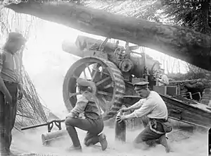 After serving in the Ypres Salient, the battery moved south in June 1916 to join Fourth Army in the opening bombardment for the Battle of the Somme, supporting the attack on Fricourt. It remained on the Somme for the whole of that summer's offensive.[38][39] In early 1917 47th Siege Bty was moved to the Arras sector with First Army, which was preparing for the Battle of Vimy Ridge. As part of 13th Heavy Artillery Group (HAG) it was positioned Marœuil near Arras firing in support of Canadian Corps. The artillery plan for the heavy guns emphasised counter-battery (CB) fire. At Zero hour, while the field guns laid down a Creeping barrage to protect the advancing infantry, the heavy howitzers fired 450 yards (410 m) further ahead to hit the rear areas on the reverse slope of the ridge, especially known gun positions. The attack went in on 9 April, when the Canadians overran three trench lines and seized the crest of the ridge where the batteries soon established observation posts (OPs).[30][38][40][41][42] At the end of the Arras Offensive the battery returned to Ypres, where it was brought up to a strength of six guns when it was joined by a section from the newly arrived 340th Siege Bty. It fought through the Third Ypres Offensive until November 1917.[29][30][38]
