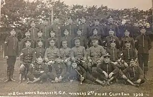 On the outbreak of war the Hampshire RGA mobilised under the command of Lt-Col J.E. Dawe, TD, in Nos 6–9 Fire Commands.[8][14] Shortly afterwards TF units were invited to volunteer for Overseas Service and on 15 August 1914, the War Office (WO) issued instructions to separate those men who had signed up for Home Service only, and form these into reserve units. On 31 August, the formation of a reserve or 2nd Line unit was authorised for each 1st Line unit where 60 per cent or more of the men had volunteered for Overseas Service. The titles of these 2nd Line units would be the same as the original, but distinguished by a '2/' prefix. In this way duplicate companies and batteries were created, releasing the 1st Line units to be sent overseas.[27]
