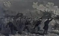 In August 1862, the regiment fell under the control of General John Pope. At the Second Battle of Bull Run (also known as the Second Battle of Manassas), the 5th New York Volunteer Infantry regiment was forced to withstand the advancing forces of General James Longstreet. In underestimating the size of the Confederate army, Pope ordered the regiment to support Hazlett's Battery. Longstreet's soldiers easily outnumbered the small regiment, met by the 5th Texas Vol. Of the famous Texas Brigade's who elite soldiers accurate musket volleys quickly inflicted massive casualties in the regiment. In just 10 minutes of fighting, the 5th New York lost 332 men of the approximately 525 engaged.[29] At least 119 of the casualties were killed outright or died of their wounds. The addition of two missing who were never accounted for would bring the death total to 121. It was the greatest battle fatality sustained by any Federal infantry unit in the war.[29] The entire Color Guard was killed, except for one man. The only officer to survive the battle was Captain Cleveland Winslow. The regiment was effectively removed as a combat regiment, never again serving in the battle line.