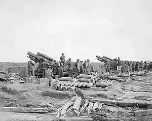 From Villers-Faucon, 94th Siege Bty supported the minor operations by which Fourth Army closed up to the Hindenburg Line, followed by the Battle of Épehy and the capture of Ronssoy (18 September).[12][85][92][93][94][95] The battery was then ordered into the ruins of Ronssoy, which involved hauling the guns across shell-holed country by night and cramming the guns into limited space at the west end of the ruins. The village was under constant harassing fire with gas and HE, and casualties were heavy. Getting ammunition up the terrible roads was a serious problem. From these positions the battery supported Australian Corps (with II US Corps under command) in its attack on the Hindenburg Line at the Battle of the St Quentin Canal (29 September), for which the bombardment began on 26 September. The US troops had to attempt to gain some preliminary objectives before the main attack went in. Despite some shortcomings, the Australian–US attack was a success.[12][53][96][97][98][99][100]