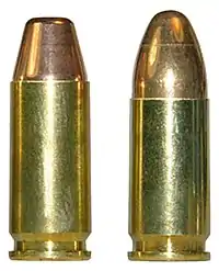 9×21mm (left) and parent 9×19mm Parabellum (right) cartridges