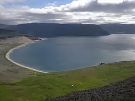 Aðalvík is a bay located in the southwest part of Hornstrandir on Iceland. The bay splits into three main locations, the former fishing villages of Látrar (120 inhabitants in 1920) and Sæból (80 inhabitants in 1900) and Miðvík. All of the settlements were abandoned in the middle of the 20th century. The last inhabitants moved from Látrum and Sæból in October 1952.[1][2][3] In Sæból and on the mountain above it, named Darri, the British occupation force built a military base during World War II, which remains can still be seen, including remains of anti-aircraft guns, buildings, roads and railway tracks. In Látrar and on Straumnesfjall, the United States Air Force built a radar station named Straumnes Air Station. An airstrip was also built just outside the village. Jakobína Sigurðardóttir wrote the poem Hugsað til Hornstranda to protest the military activity there.[4]
