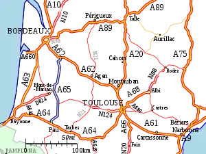 The A65 autoroute is a motorway in south west France. Construction started in 2008 and it was officially opened on 14 December 2010.[1] It connects Langon (Gironde) to Pau (Pyrénées-Atlantiques), with a toll payable of € 19.70 for the complete journey by car.