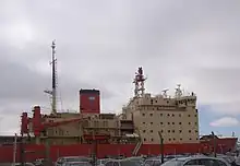 The Tandanor shipyard repaired the fire damage and also reconfigured the vessel to increase laboratory space from 74 m2 (800 sq ft) up to 415 m2 (4,470 sq ft). This allows the ship to be used primarily as a research vessel in addition to its role of resupplying the southernmost Antarctic base Belgrano II.[3] The diesel engines have been replaced by four new ones purchased from MAN in October 2011.[3][36][37] The main radar of Irízar was also repaired in Argentina by CITEDEF.[4] Work was initially estimated to be finished by November 2011,[38] but it was not until April 2017 that the icebreaker was declared seaworthy again.[39]