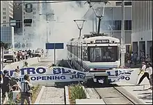 The line initially opened as the Blue Line on Saturday, July 14, 1990, for US$877 million (equivalent to $1.96 billion in 2022 adjusted for inflation),[8] and ran from Pico to Anaheim Street. The Long Beach Loop section to Long Beach opened in September 1990,[13] followed by the tunnel into 7th Street/Metro Center in February 1991.