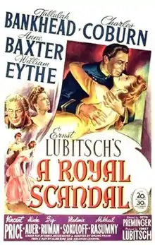 A Royal Scandal, also known as Czarina, is a 1945 American comedy-drama film directed by Otto Preminger, produced by Ernst Lubitsch. about the lovelife of Russian empress Catherine the Great. It stars Tallulah Bankhead, Charles Coburn, Anne Baxter and William Eythe. The film was based on the play Die Zarin (The Czarina) by Lajos Bíró and Melchior Lengyel.