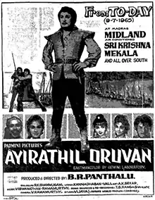 Aayirathil Oruvan (transl. One in a Thousand) is a 1965 Indian Tamil-language swashbuckler film produced and directed by B. R. Panthulu. The film stars M. G. Ramachandran and Jayalalithaa, with M. N. Nambiar, Manohar, Nagesh, S. V. Ramadas, Vijayalakshmi and Madhavi in supporting roles. It revolves around a doctor who is sold into slavery for rebelling against the dictator of his nation, and later forced into a life of piracy.