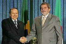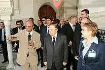 Bouteflika presided over the Organisation of African Unity in 2000, secured the Algiers Peace Treaty between Eritrea and Ethiopia, and supported peace efforts in the African Great Lakes region.[27] He also secured a friendship treaty with nearby Spain in 2002, and welcomed president Jacques Chirac of France on a state visit to Algiers in 2003.[28][29] This was intended as a prelude to the signature of a friendship treaty.[29]