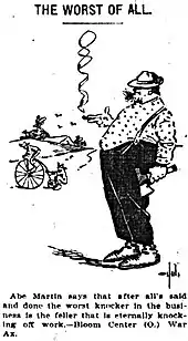 Abe Martin was an anti-hero character, making wisecracker jokes and uttering sayings which became popular over the country. He made his first appearance on December 17, 1904.[2] Originally the character's locality wasn't specified, but in a strip from February 3, 1905, he announced: "I'm goin' ter move ter Brown County Tewmorrow", which he did.[3] At the time the character's popularity was such that by 1910 over 200 newspapers carried the strip and special almanacs were made.[4] Notable fans were George Ade, Will Rogers, and James Whitcomb Riley.[2] In an interview with Dick Cavett, S. J. Perelman said Groucho Marx read and quoted Hubbard's writing.[5]