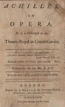 The opera is a burlesque parody of the story of Achilles on Skyros, based on legends of Achilles as related by Bion, Ovid, and Statius (notably the latter's Achilleid).[1] Unsuccessful attempts were made at the time to interpret the work as a political satire (as was Gay's The Beggar's Opera) but no convincing case has been made for this.[2] Unlike The Beggar's Opera and Gay's other ballad opera, Polly, Achilles uses not only tunes from popular music, but also employs melodies from concertante works of Arcangelo Corelli.[3] Achilles proved popular; the first performance alone brought John Rich over £200, and the opera ran for over a month after its premiere on 10 February 1733.[4]