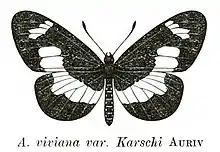A. karschi Auriv. (56 c) is intermediate between Acraea viviana and Acraea cabira and differs from both in having the hindmarginal spot on the upperside of the forewing narrower, of more uniform breadth and not covering the base of cellule 2. The under surface of the hindwing exactly agrees with that of cabira. Is perhaps, as Eltringham thinks, only a form of cabira. Cameroons and British East Africa. [4]