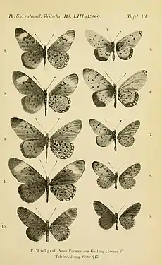 - ↑ Wichgraf, F. 1909. Beschreibung neuer Formen der Gattung Acraea F. aus Rhodesia, Mashunaland und Angola. Berliner Entomologische Zeitschrift 53: 240-247.
