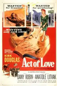 Act of Love (French title: Un acte d'amour) is a 1953 American romantic drama film directed by Anatole Litvak, starring Kirk Douglas and Dany Robin. It is based on the 1949 novel The Girl on the Via Flaminia by Alfred Hayes.[2] A Parisian falls in love with an American soldier near the end of World War II.