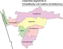 Three legislative assembly segments: Kaipamangalam, Chalakudy and Kodungallur are in Thrissur district and four legislative assembly segments: Perumbavoor, Angamaly, Aluva and Kunnathunad are in Ernakulam district. Kaipamangalam assembly segment also came into existence in 2008, following delimitation of legislative assembly constituencies. Chalakudy, Kodungallur, Perumbavoor and Angamally were earlier part of the erstwhile Mukundapuram Lok Sabha constituency.[18]