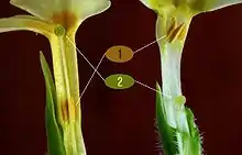 Adnation in angiosperms is the fusion of two or more whorls of a flower, e.g. stamens to petals".[1] This is in contrast to connation, the fusion among a single whorl.[2][3]