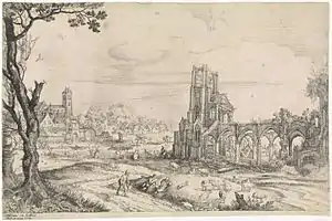 Van Stalbemt was also active as a printmaker. A series of landscape prints by his hand represent respectively a coastal marine view with ships, a watermill, a windmill, ruins and a castle on a mountain.[8]