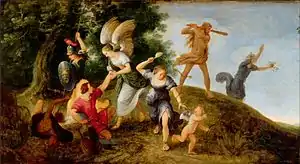 Other works are duller in colour and do not display the same meticulous brush technique. The composition David slaying Goliath (1618, Museo del Prado, Madrid) is a collaborative work with Pieter Brueghel the Younger, in which the figures were the work of van Stalbemt. One group of works previously attributed to Adam Elsheimer has been reattributed to van Stalbemt. The influence of Elsheimer, which is particularly apparent in the composition, is believed to have been passed on via David Teniers the Elder, who had worked for a period in Elsheimer's studio.[5] Van Stalbemt's later work shows similarities with Hendrick van Balen's work.[1]