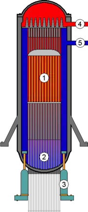 Pressure vessel from the ABWR. 1: Reactor core 2: Control rods 3: Internal Water Pump 4: Steam pipeline to the Turbine generator 5: Cooling water flow to the core