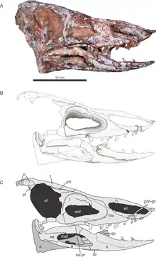 - ↑ Paes-Neto, V.D.; Desojo, J.B.; Brust, A.C.B.; Ribeiro, A.M.; Schultz, C.L.; Soares, M.B. (2021). "The first braincase of the basal aetosaur Aetosauroides scagliai (Archosauria: Pseudosuchia) from the Upper Triassic of Brazil". Journal of Vertebrate Paleontology. 41 (2): e1928681. doi:10.1080/02724634.2021.1928681. S2CID 237518035.