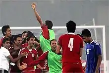 Players are celebrating after winning their 2011 SAFF Championship Semi-final against Nepal