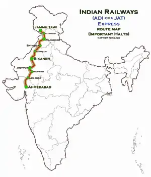 The 19223/19224 Ahmedabad–Jammu Tawi Express is an Express train belonging to Indian Railways that runs between Ahmedabad Junction and Jammu Tawi in India.[1]