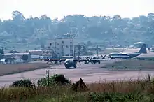 The Tanzanian Air Wing retaliated by successfully bombing fuel depots at Kampala, Jinja and Tororo on 1 April.[80][81][84] One air strike coincidentally hit and destroyed the Libya-Uganda Development Bank in Jinja.[82] By chance, Amin was in the town at the time, and panicked when the bomb hit. According to eyewitnesses, he ran "into the street screaming incoherently".[80] The destruction of the development bank led many Ugandan soldiers to believe that the Tanzanians had acquired special munitions that could hit select targets on command.[82] Tanzanian MiG-21 jets also raided Entebbe Air Base, strafing the runway and setting part of the terminal ablaze, but ultimately failing to cause enough damage to halt the Libyan air lift in support of Amin's regime.[84][85] Radio Uganda later announced that Amin had said the attacks by the "so-called Tanzanian Air Force...will not escape a very heavy punishment".[86] Radio Uganda also claimed that Amin said that "the bombings do not worry him at all" and repeated that "Nyerere will regret the consequences".[86] The TPDF also attempted to disrupt the Libyan airlift by tricking incoming planes into landing at Mwanza by sending messages to them on Entebbe Air Base's radio frequency. The Tanzanians ended this practice after one attempt, having mistakenly misdirected and seized a Belgian Sabena cargo plane.[87][lower-alpha 12]