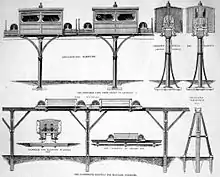 The railway could sometimes only be 3 feet (0.9 m) above the surface, while crossing valleys or ravines it could be from 20 to 30 feet (6.1 to 9.1 m) high from the ground, and it could have curves or gradients as on any other railway. These longitudinal beams form continuous sleepers and carried four rails; two on their upper surfaces, and two on their outer sides; the surface rails were of iron, these carried the train, and could be of any gauge, from 8 inches (200 mm) to 18 in (457 mm); the side rails were of wood or iron, nailed along near the lower edges of the beams, so as to be below the level of the carrying rails. They were peculiar to this system, and acted as guides for the horizontal wheels of the waggons and carriages. Where sidings occurred, or shunting was required, the switches were formed by making a 20 feet (6.1 m) length of the railway to point on one end, while the other end was resting on a pair of rollers, traveled from the main line to and from the siding.[3]