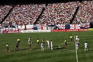 Ramírez made his senior international debut on November 20, 2002, under Francisco Maturana coming in for John Restrepo in a 1–0 loss against Honduras.[113] The following year Ramírez capped twice for Colombia in friendlies against Mexico in Phoenix and South Korea in Busan.[114][115] After not capping in 2004, Ramírez returned to the national team in a friendly on February 23, 2005, against Mexico in Culiacán and also appeared in a friendly against the United States in Fullerton two weeks later.[116] Ramírez scored his first international goal in a friendly against England in East Rutherford, in which Colombia lost 3–2.[117] He was later called to the 2005 CONCACAF Gold Cup by Reinaldo Rueda where he appeared in three matches as Colombia was eliminated in the semifinals.[118] After going uncapped in 2006, Ramírez appeared in three 2010 World Cup qualifiers in 2007, two as a sub and a start against Venezuela.[119] In 2008, he appeared in a friendly against Honduras in Fort Lauderdale in which Colombia lost.[120]