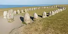 Ale's Stones (Swedish: Ales stenar or Ale stenar) is a megalithic monument in Scania in southern Sweden. It is a stone ship, oval in outline, with the stones at each end markedly larger than the rest. It is 67 m (220 ft) long formed by 59 large boulders, weighing up to 5 tonnes each.